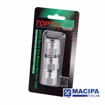 Set montare/demontare piulițe amortizor MAC1012JGAR0303, 3 piese, potrivit pentru Audi, Seat, Skoda, VW. Dimensiuni mufe 10,5mm, 12,5mm și 14,5mm, ideal pentru întreținerea amortizoarelor.